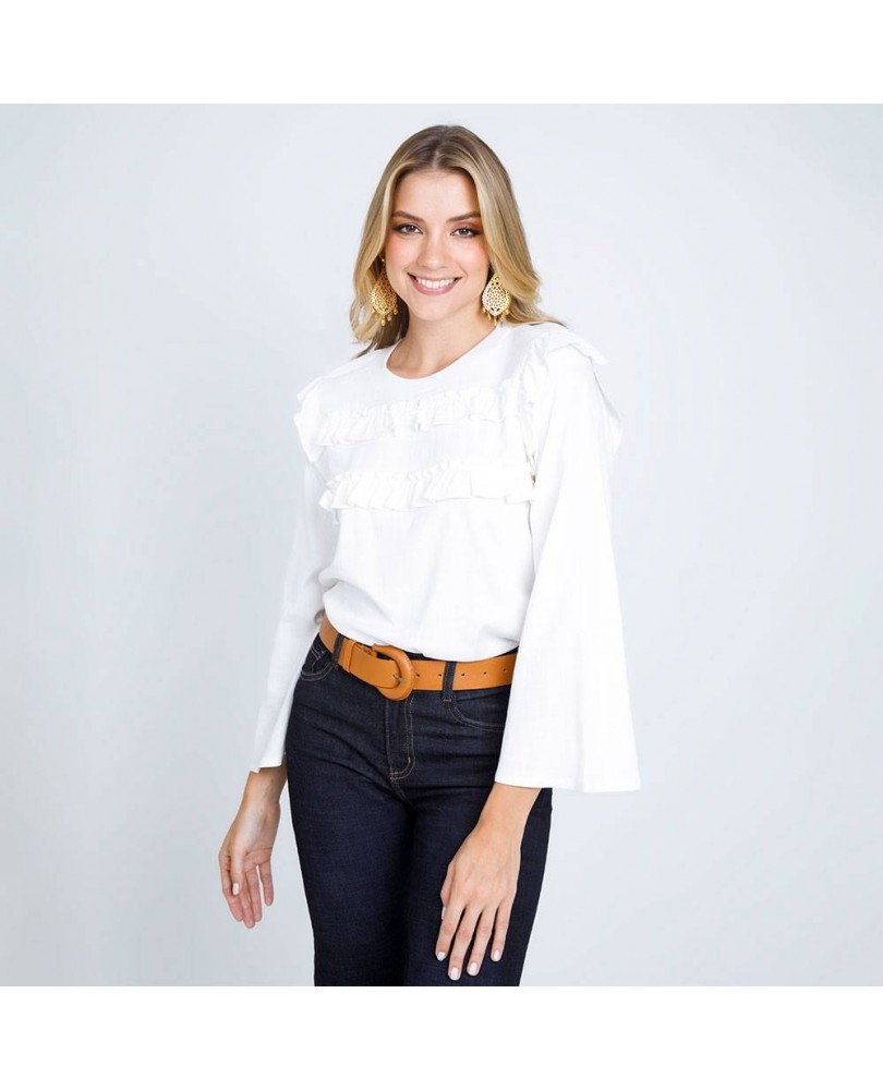 Blusa manga larga blanca de poesía. Esta blusa blanca llena de detalles de boleros en la parte delantera y hombro, su textura, su tela, nos hace sentir como una poesía viva. Esta pieza siempre será una buena elección que llamará la atención y elevará nuestro Outfit.