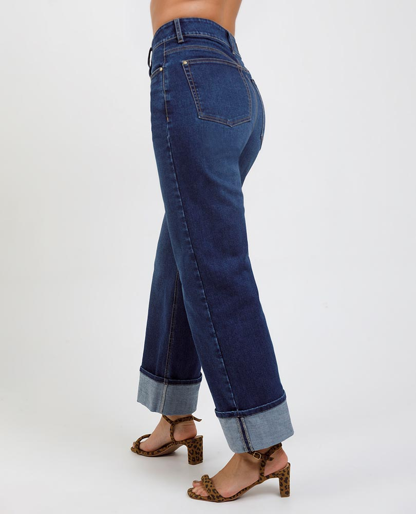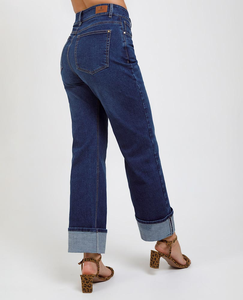 JEAN REGULAR PARA MUJER CON BOTA DOBLADA TONO MEDIO CINCO BOLSILLOS - ALGODON 61% POLIESTER 33% 4% VISCOSA 2%ELASTANO