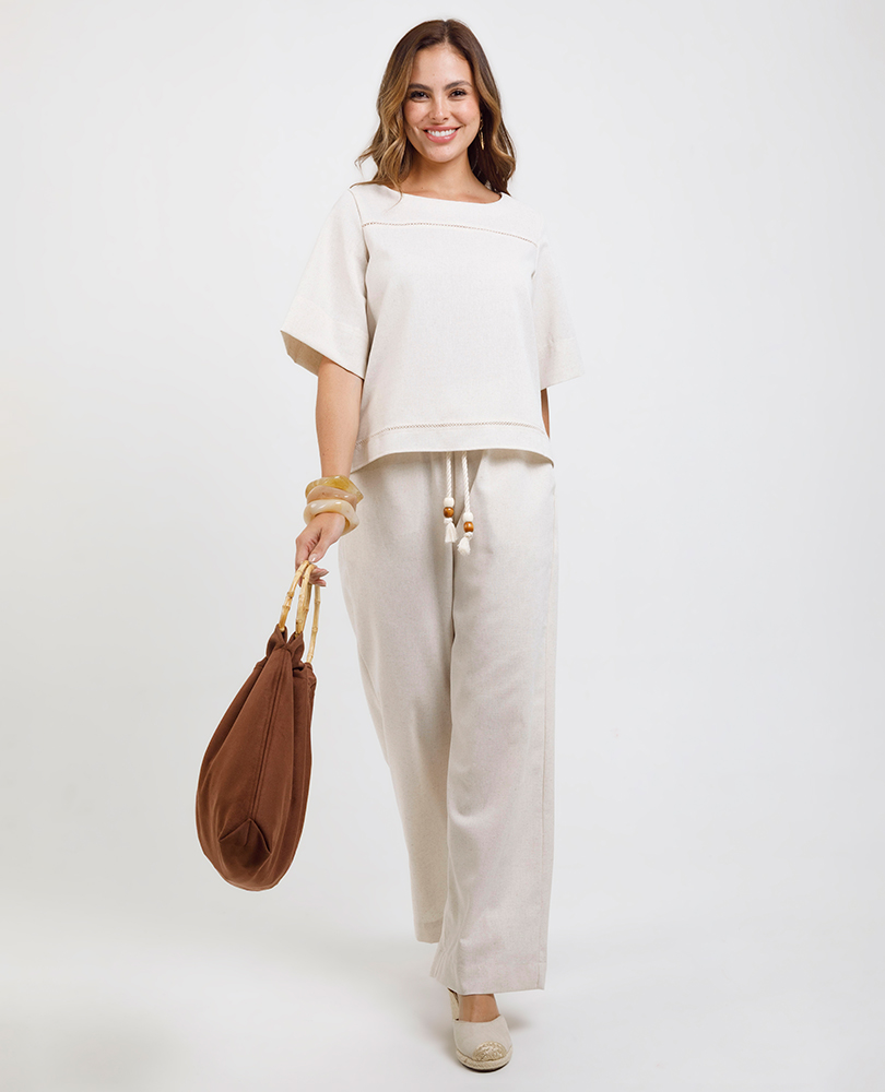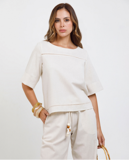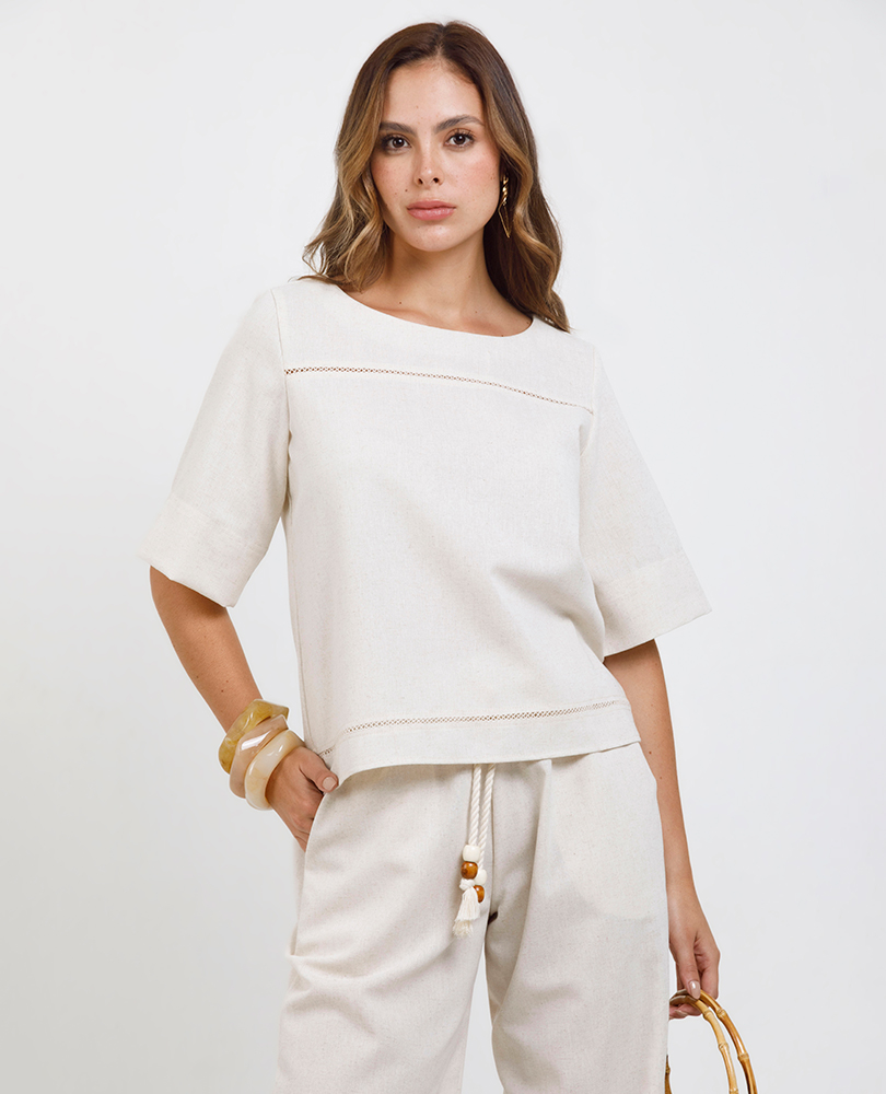 Blusa para mujer en mezcla de lino, con manga corta y puntadas artesanales que realzan su diseño único y natural.