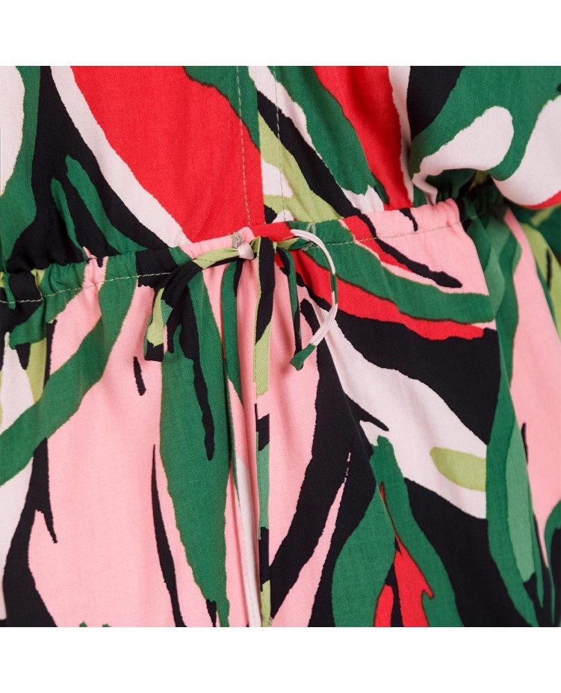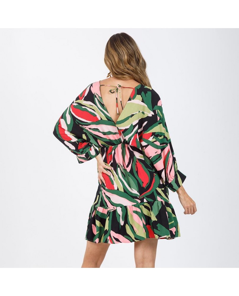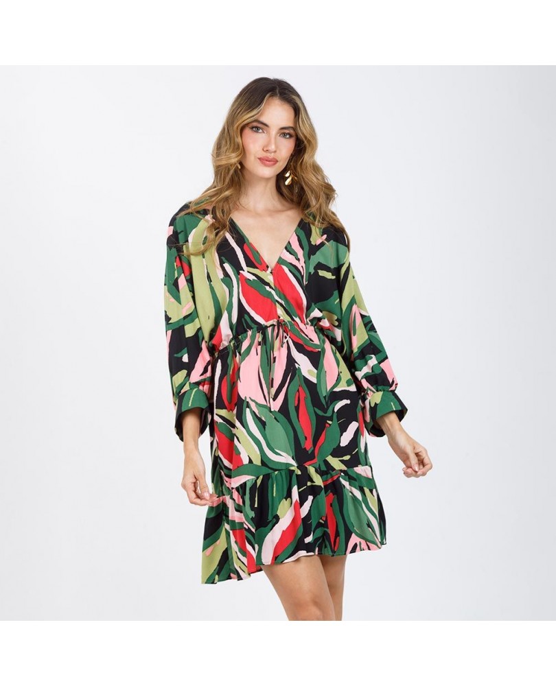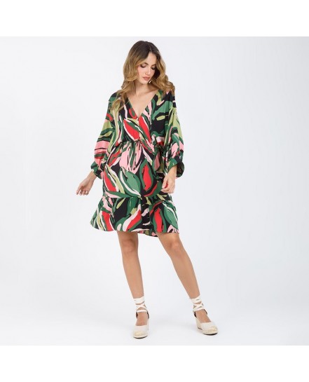 VESTIDO ESTAMPADO PARA MUJER CORTO CON ESCOTE V Y CANAL EN CINTURA - VISCOSA 100%
