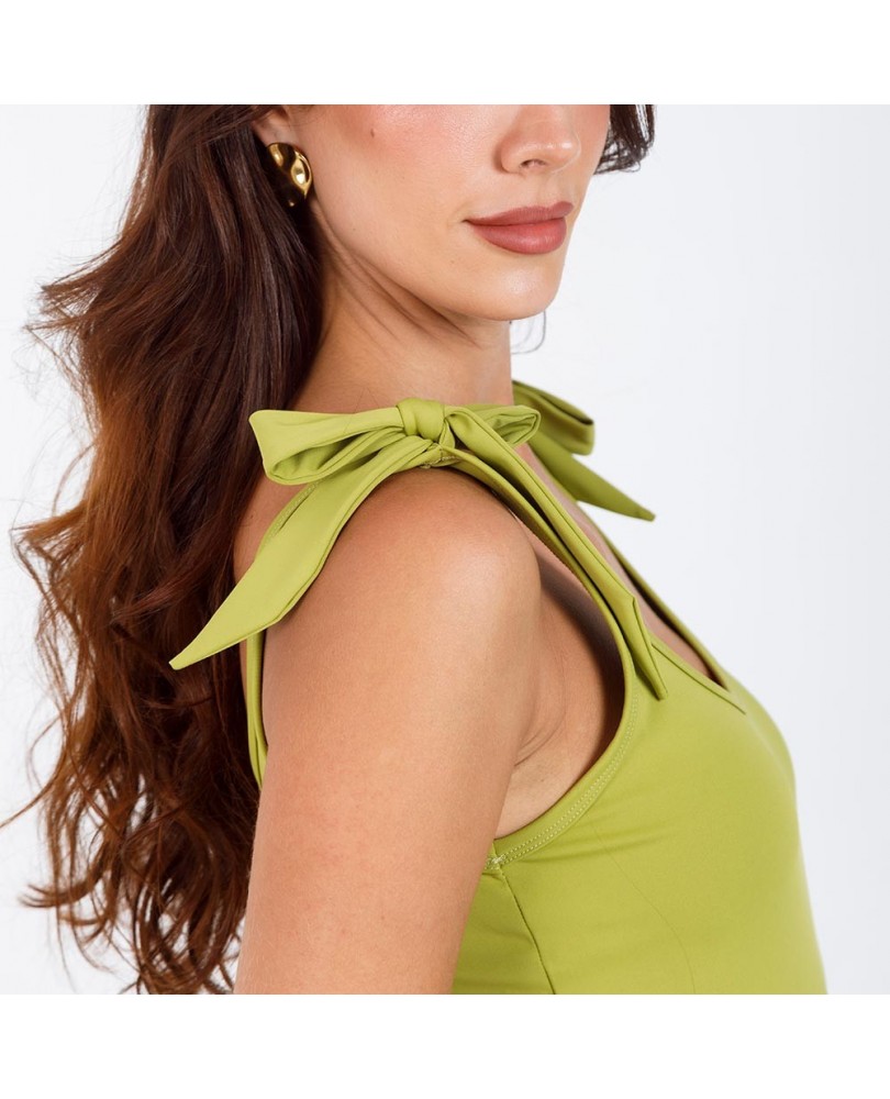 Camiseta sin mangas para mujer, diseñada con moños decorativos que añaden un toque femenino y juguetón. Ideal para un look casual y elegante, esta prenda combina comodidad con estilo, perfecta para un día relajado o una salida informal. La sencillez del diseño se complementa con los moños, que le otorgan un detalle distintivo y encantador. La modelo usa talla 8