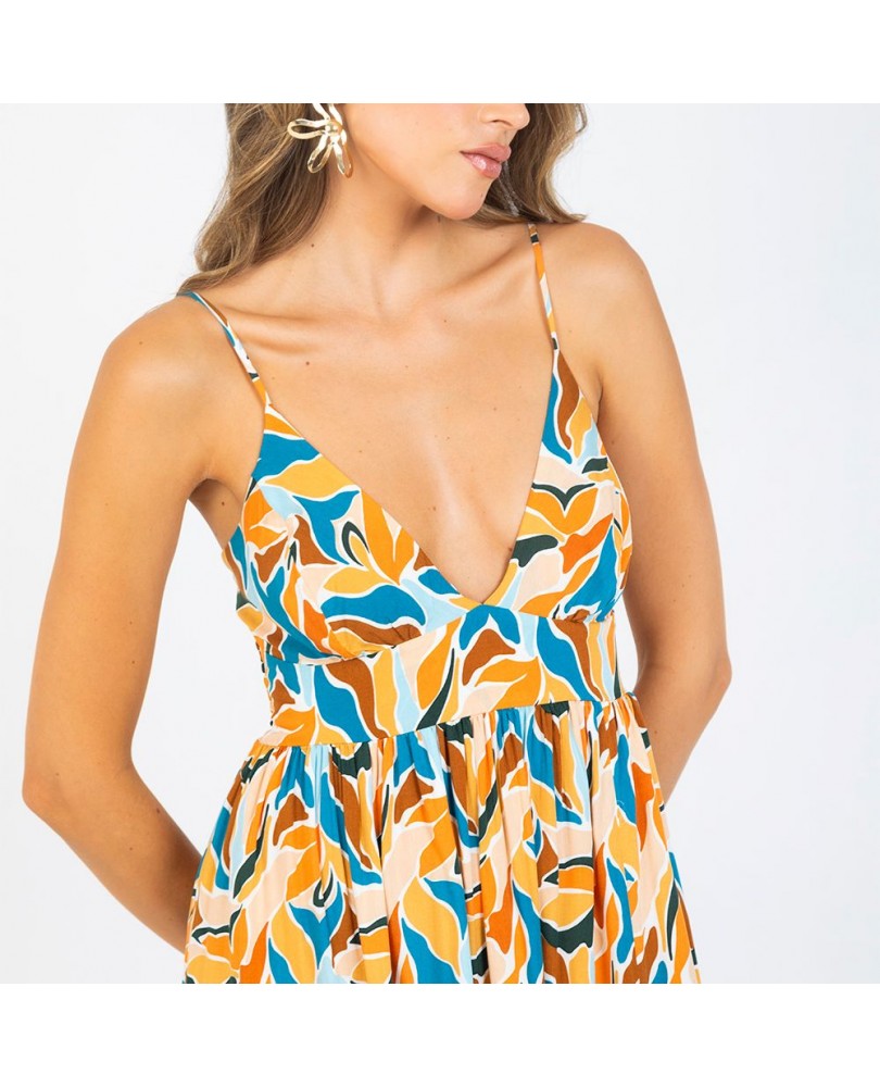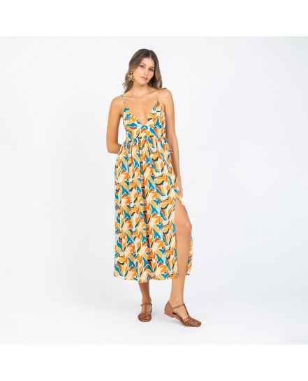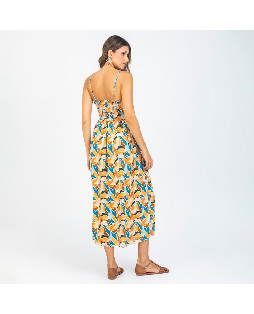 VESTIDO LARGO PARA MUJER ESTAMPADO CON TIRAS GRADUABLES Y NIDO DE ABEJA ESPALDA - VISCOSA 100%